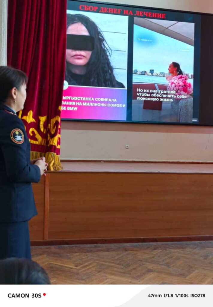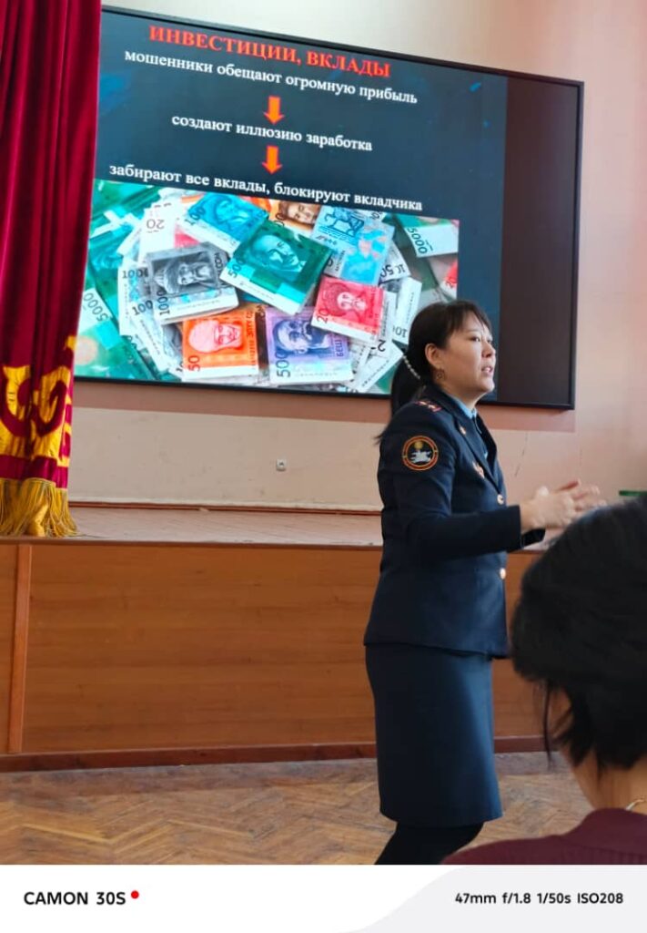 Иш-чарага Кыргыз Республикасынын Ички иштер министрлигинин Кылмыш иликтөө башкы башкармалыгынын (ГУУР) кызматкери, юридика илимдеринин кандидаты, милициянын подполковниги Назаркулова Чолпон Назаркуловна чакырылып, студенттер үчүн мазмундуу баяндама берди. Ал киберкылмыштуулук жана киберкоопсуздук жаатындагы заманбап коркунучтар, интернет алдамчылык, жеке маалыматтарды коргоо жана мындай кылмыштардын алдын алуу жолдору тууралуу кеңири маалымат берди.