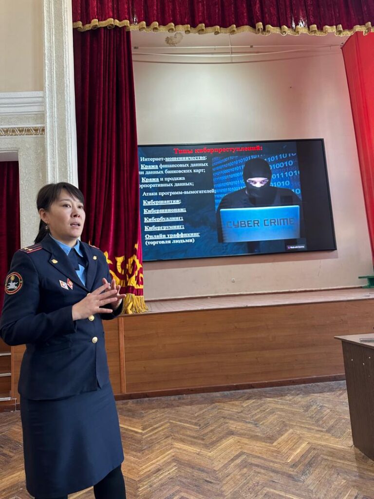 В мероприятии приняла участие сотрудник Главного управления уголовного розыска Министерства внутренних дел Кыргызской Республики, кандидат юридических наук, подполковник милиции Назаркулова Чолпон Назаркуловна, которая выступила с содержательной лекцией для студентов. В ходе выступления были подробно рассмотрены современные угрозы в сфере киберпреступности и кибербезопасности, интернет-мошенничество, вопросы защиты персональных данных, а также меры по предупреждению подобных правонарушений.